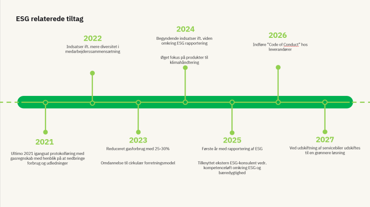 - Vi udarbejder årligt et overblik over vores fremskridt på handlinger og målsætninger inden for miljø og klima, der kan deles med vores interessenter.